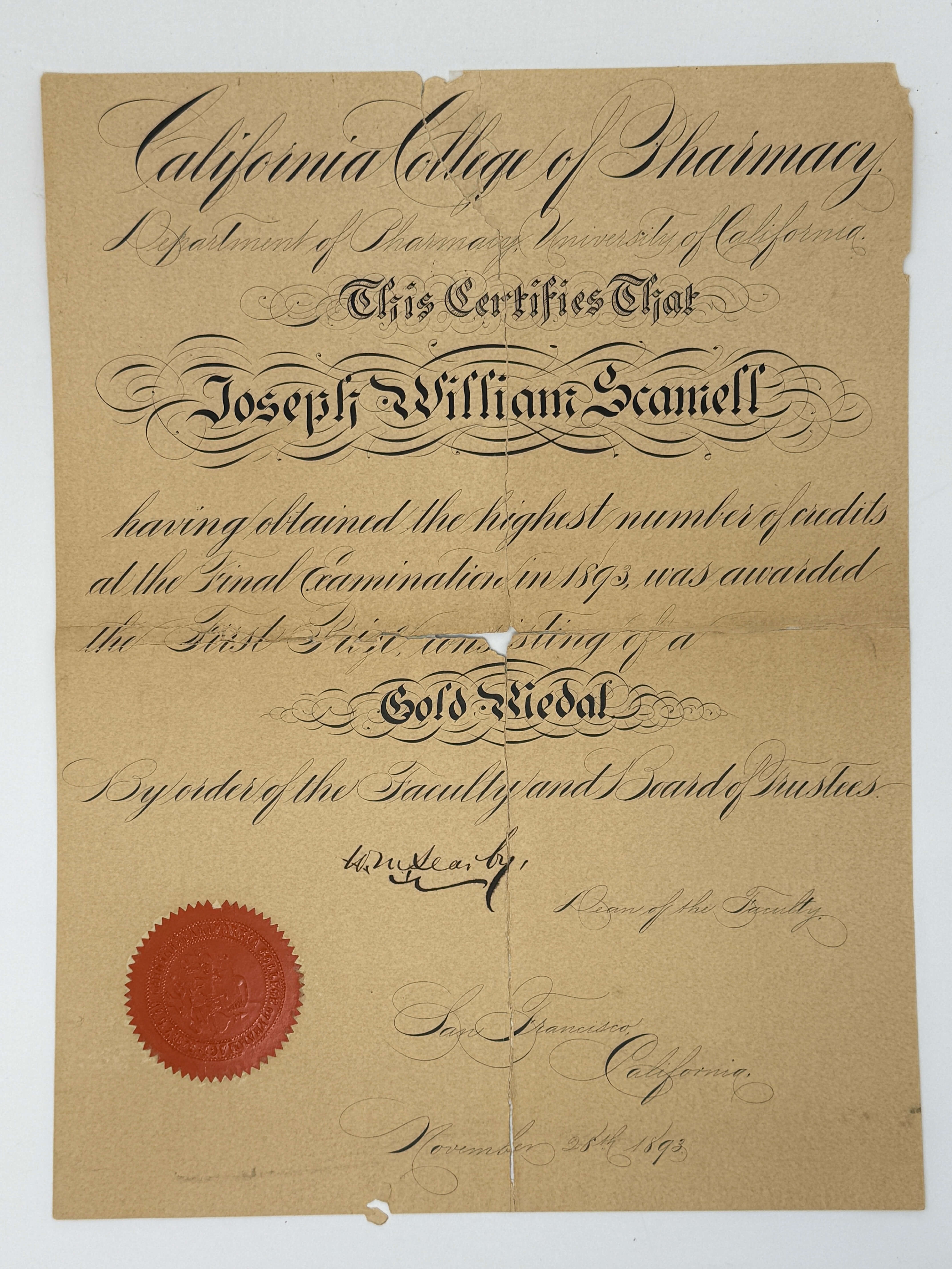 2) Scamell’s certificate from the College of Pharmacy, University of California, stating that “having obtained the highest number of credits at the Final Examination in 1893, [he] was awarded the First Prize, consisting of a Gold Medal.” Dated November 28, 1893 and signed by the Dean of the College of Pharmacy, Prof. W.W. Searby. With a red paper seal of the College of Pharmacy.