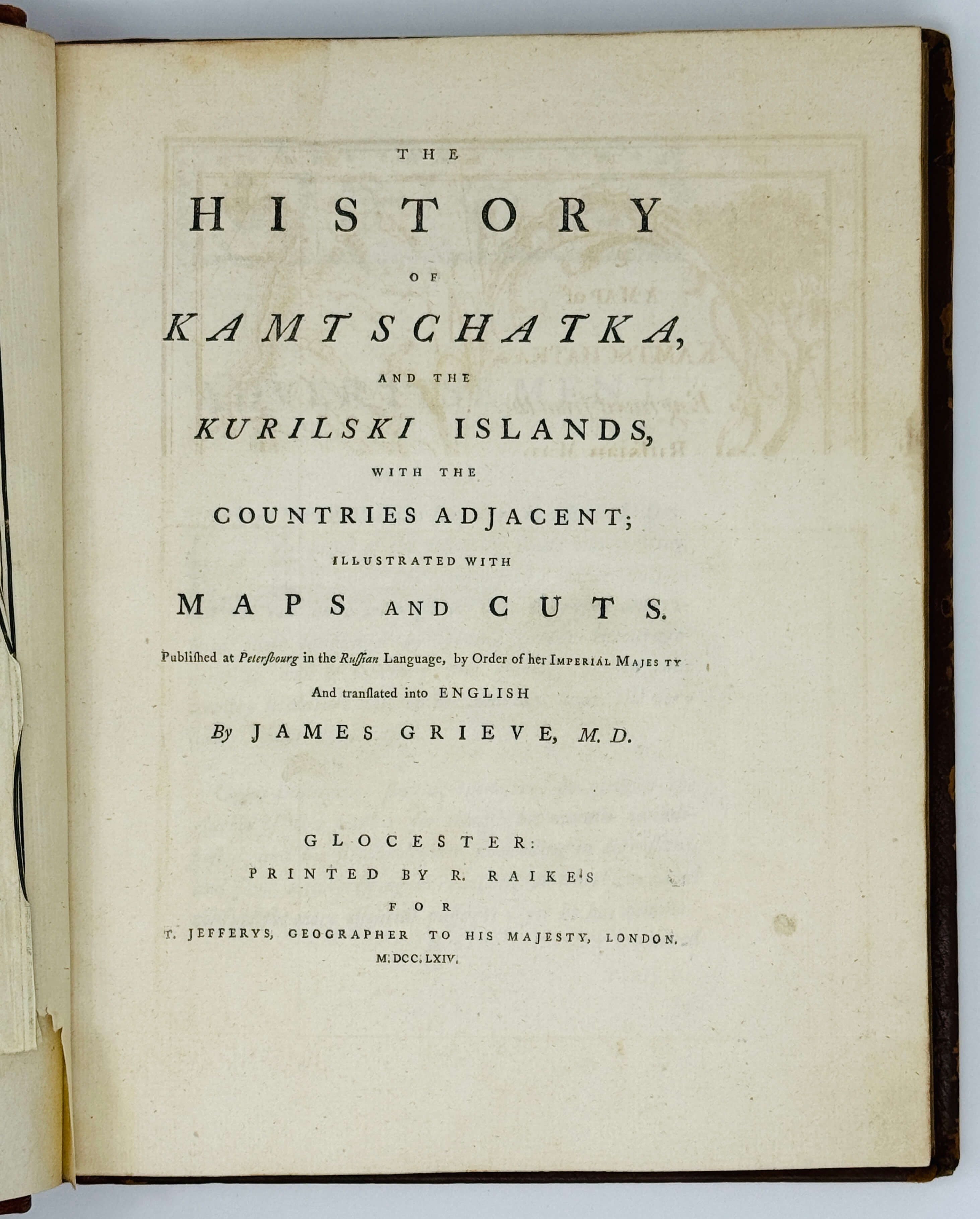 “The Russian Krasheninnikov started out across Siberia with Gerhard Friedrich Mueller and Johann Georg Gmelin, and then made his own way to Kamchatka. When Georg Wilhelm Steller arrived in Kamchatka to supervise his work, Krasheninnikov left in order to avoid becoming Steller’s assistant, and returned to St. Petersburg. Krasheninnikov nonetheless was able to make use of Steller’s notes in the preparation of his own narrative, and the inclusion of Steller’s observations on America, made during his travels with Bering’s second voyage, are an important part of this work, and constitute one of the earliest accounts of Alaska and the Aleutian Islands. Steller’s account was not published until 1793. This work details the customs, morals, and religion of the Kamchatka peninsula, and discusses the power exercised by the magicians. Also described are the differences between the dialects of the Kamchatkans and those of the Korsairs and of the Kurile islanders. This is the first scientific account of those regions”(Hill 948). “Contains one of the earliest descriptions of Russian America and the Kurile Islands”( Howes K-265). Arctic Bibliography 9264; Lada-Mocarski 12 (Russian Edition); Sabin 3830.