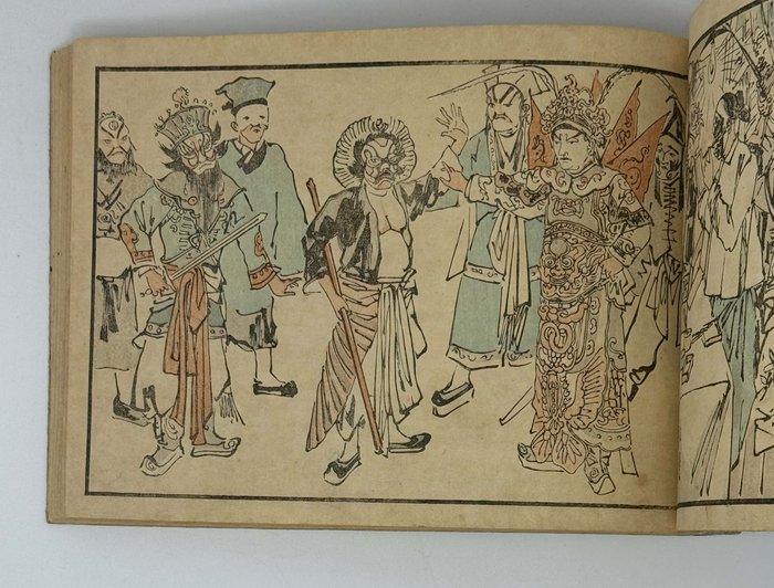 16,5x23,2 cm. 25 double page woodblock illustrations in colour. Paper oxidized. Fukuro toji binding. Woodblock printed paper wrappers, soiled and rubbed. Original title slip. Kubota’s stamp in red ink is one the front cover. Hanagire, i.e. purple silk corner protectors, are worn. Very good condition.