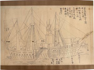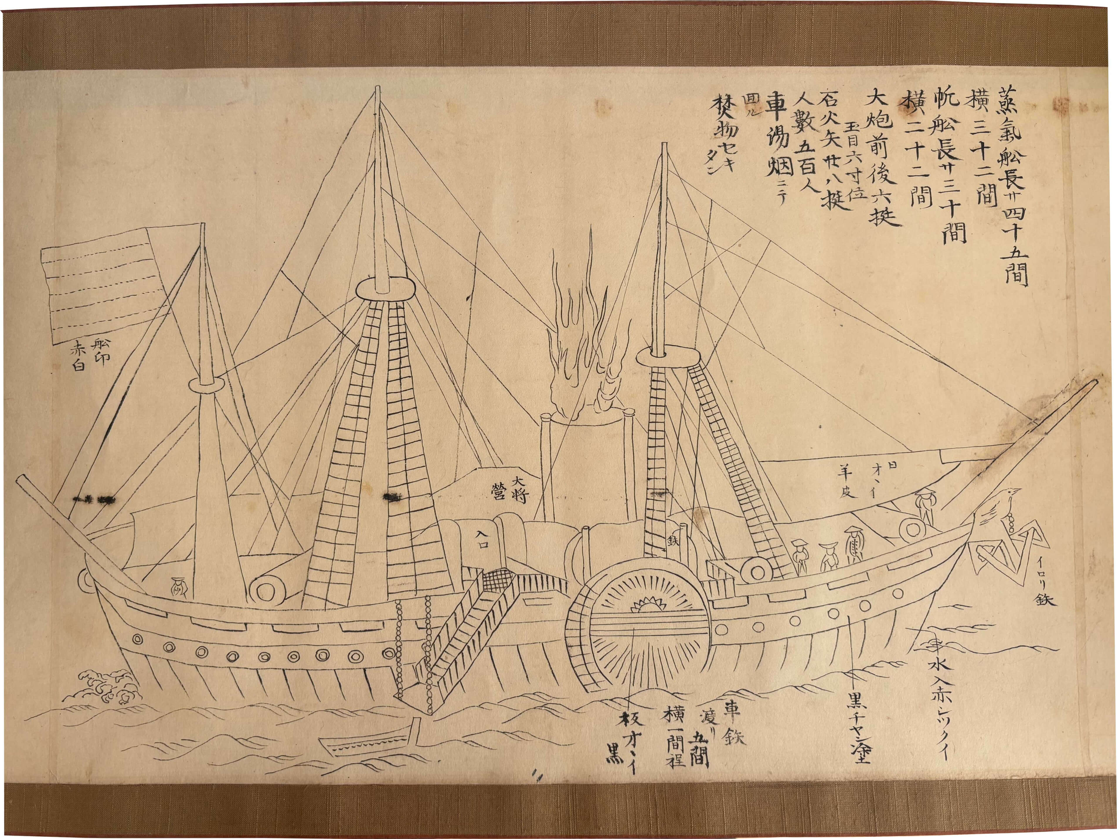 An ink inscription on the scroll reads 保戸野変宿町上下 和田 (Hodono henshuku-chō jō-ge, Wada), identifying the owner or copyist as Wada, resident of the Henshuku quarter in Hodono, a district of Kubota (present-day Akita). The term henshuku-chō refers to a quarter designated for temporary or service accommodation of officials and retainers, indicating that the scroll circulated within a provincial administrative environment rather than solely in Edo. This provenance strongly suggests that the handscroll functioned as a working document within a domainal bureaucratic or military context, used to disseminate concrete visual intelligence about the American fleet to regional authorities in northern Japan.