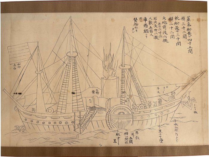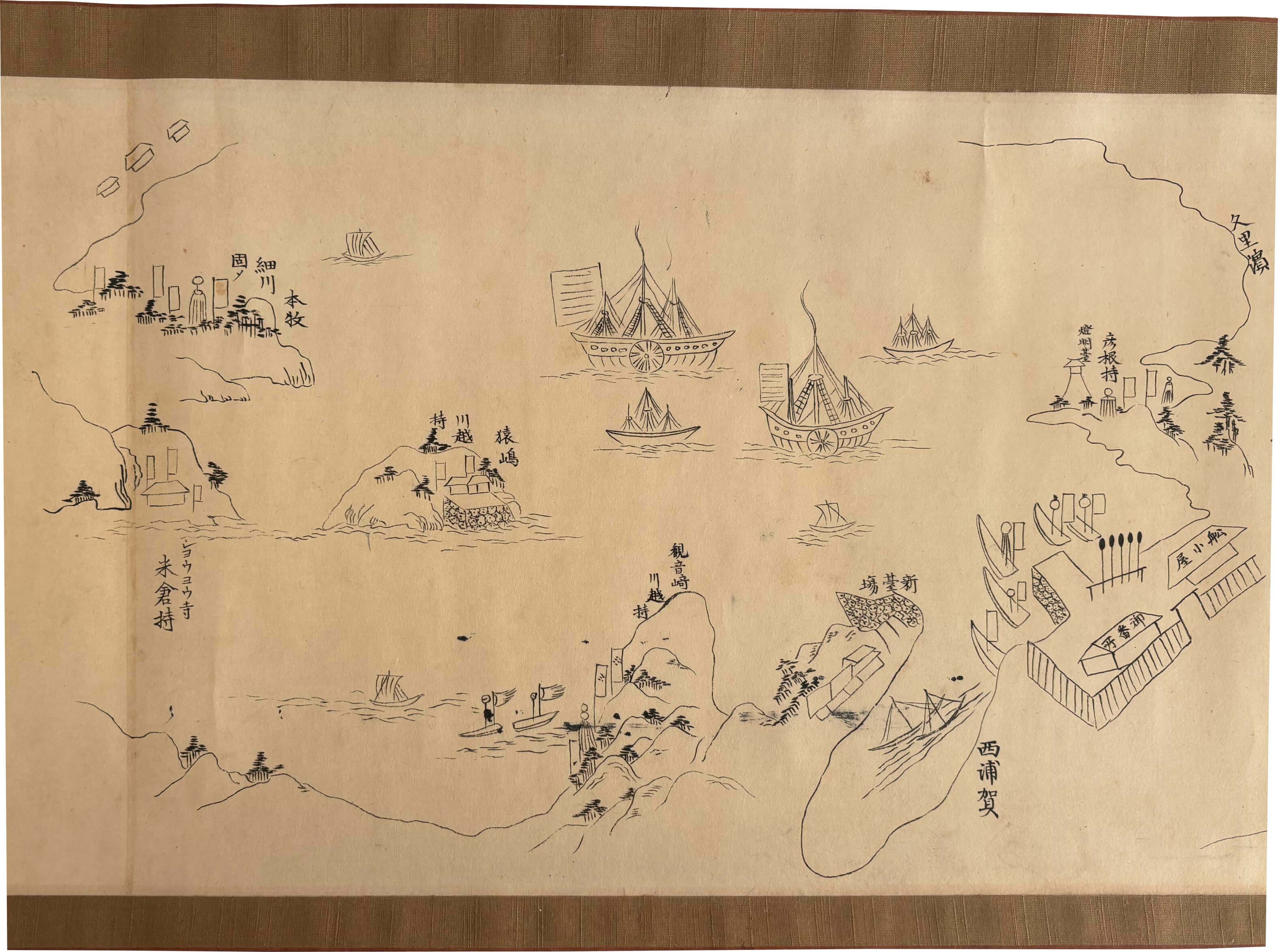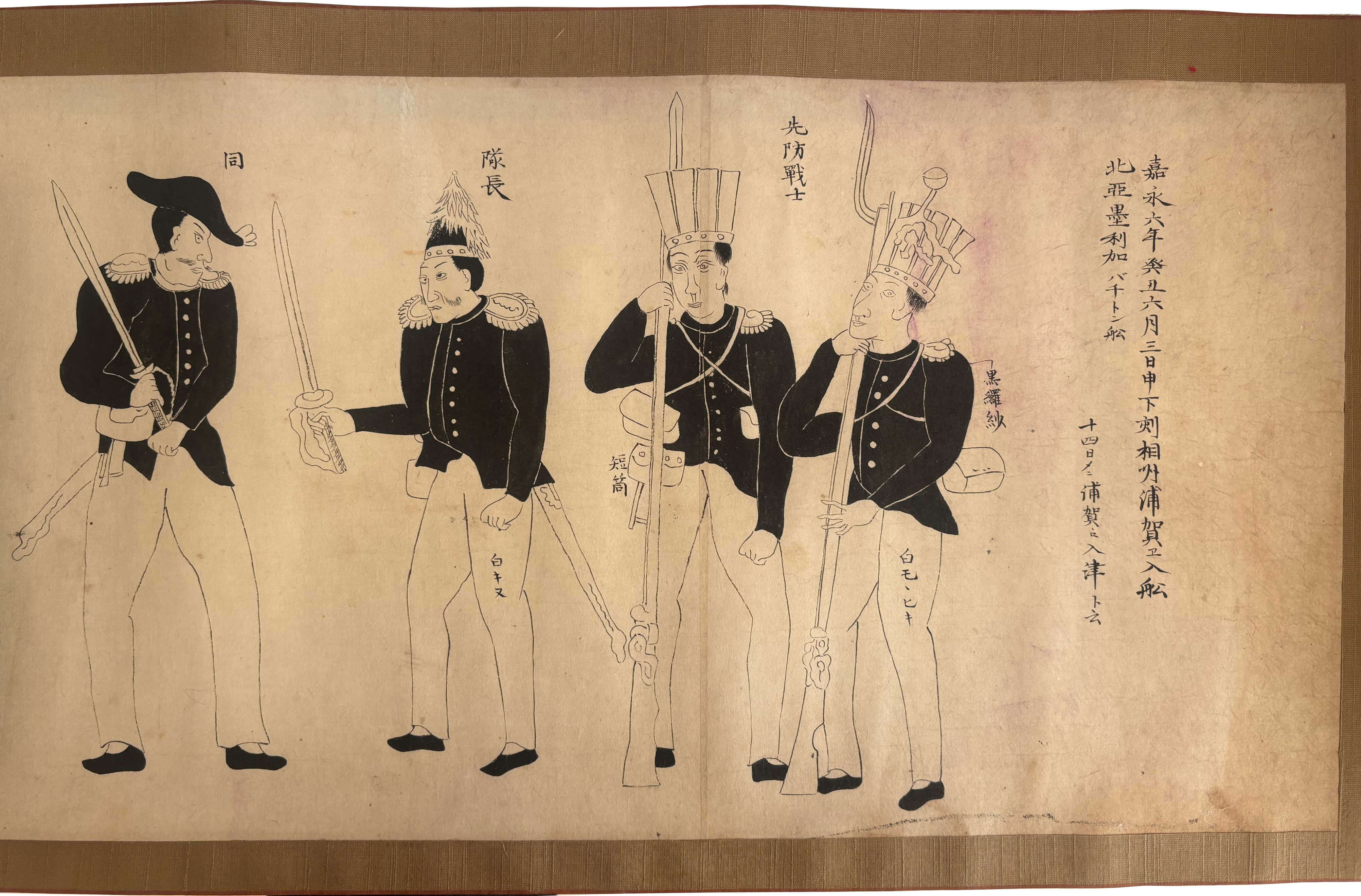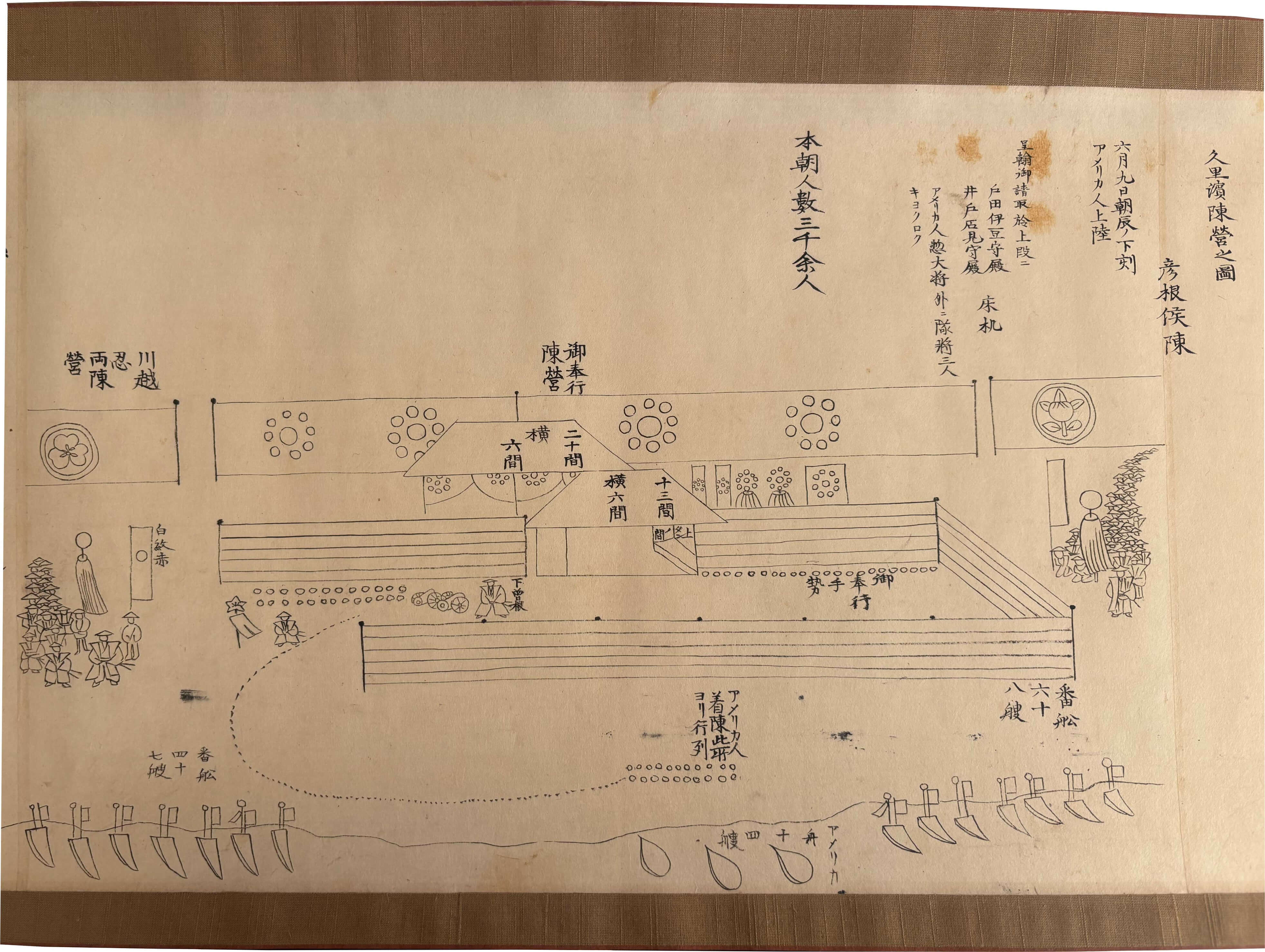 A superb example of late-Bakumatsu visual intelligence production, combining coastal cartography, technical ship schematics, and ethnographic observation into a single continuous narrative scroll devoted to Commodore Perry’s 1853 landing at Uraga.