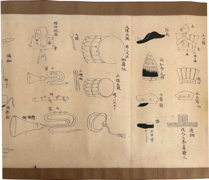 This is followed by highly analytical technical plates of the American ships: the paddle wheel system, hull construction, anchors, guns, funnels, rigging, drums, trumpets, signal equipment, and detailed diagrams of naval uniforms, hats, epaulettes, and insignia. Notably, the soldiers themselves are not hand-coloured; instead, the intended colours of their uniforms are carefully written out beside the figures, as if providing a working guide for a copyist or woodblock printer who would later execute the images in colour. Each object is isolated, labelled, and measured, transforming the foreign fleet into a catalogue of reproducible components rather than a distant spectacle.