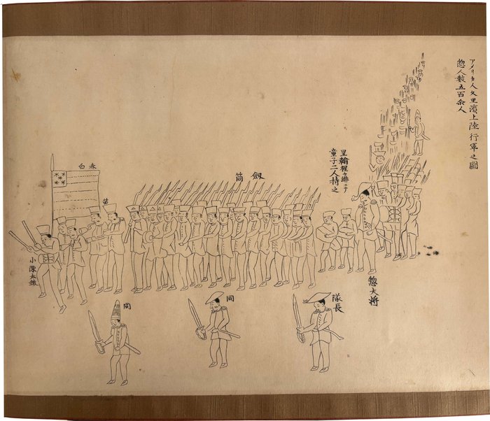 The final sections record the ceremonial procession of the American landing party at Kurihama on 14th day of the 6th month of Kaei 6 (嘉永六年六月十四日, 9 July 1853). Lines of sailors armed with rifles and sabres advance under the Stars and Stripes, while officers are individually identified by rank and dress. The accompanying annotations state that “more than three thousand Japanese” were mobilised, with contingents from the domains of Aizu, Oshi, Hikone, and Kawagoe, and that Uraga magistrates Toda Izunokami Ujiyoshi (戸田伊豆守氏栄) and Ido Iwaminokami Hiromichi (井戸石見守弘道) formally received the American party.