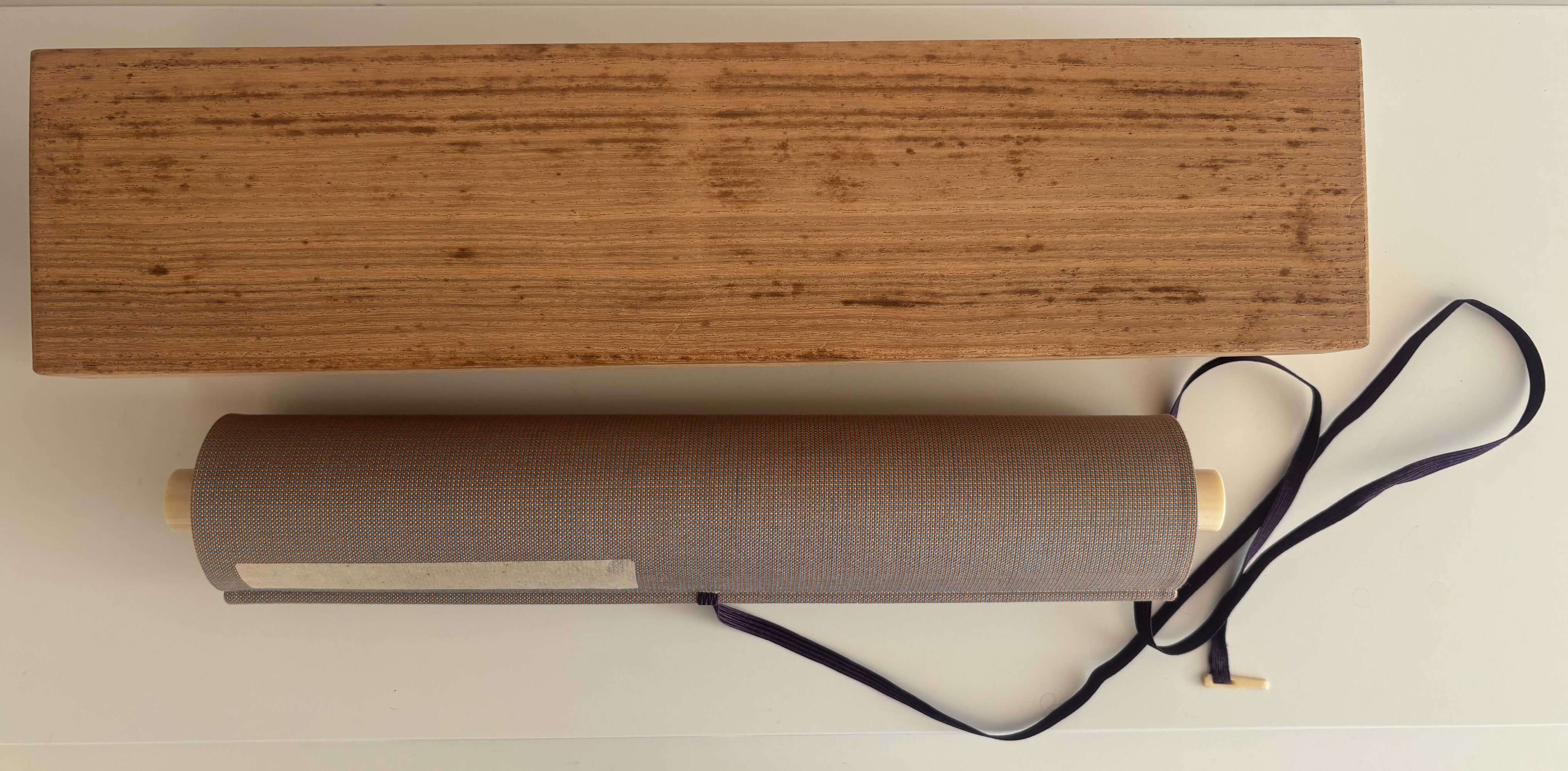 1 handscroll. Image size 27x306,1cm; Overall size 31,2x417,6 cm. Monochrome hand painted scroll. Moderate foxing. Restored and mounted on silk brocade in the 20th century. Comes with a wooden custommade box. Text in Japanese.