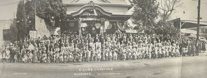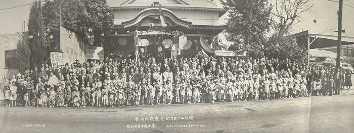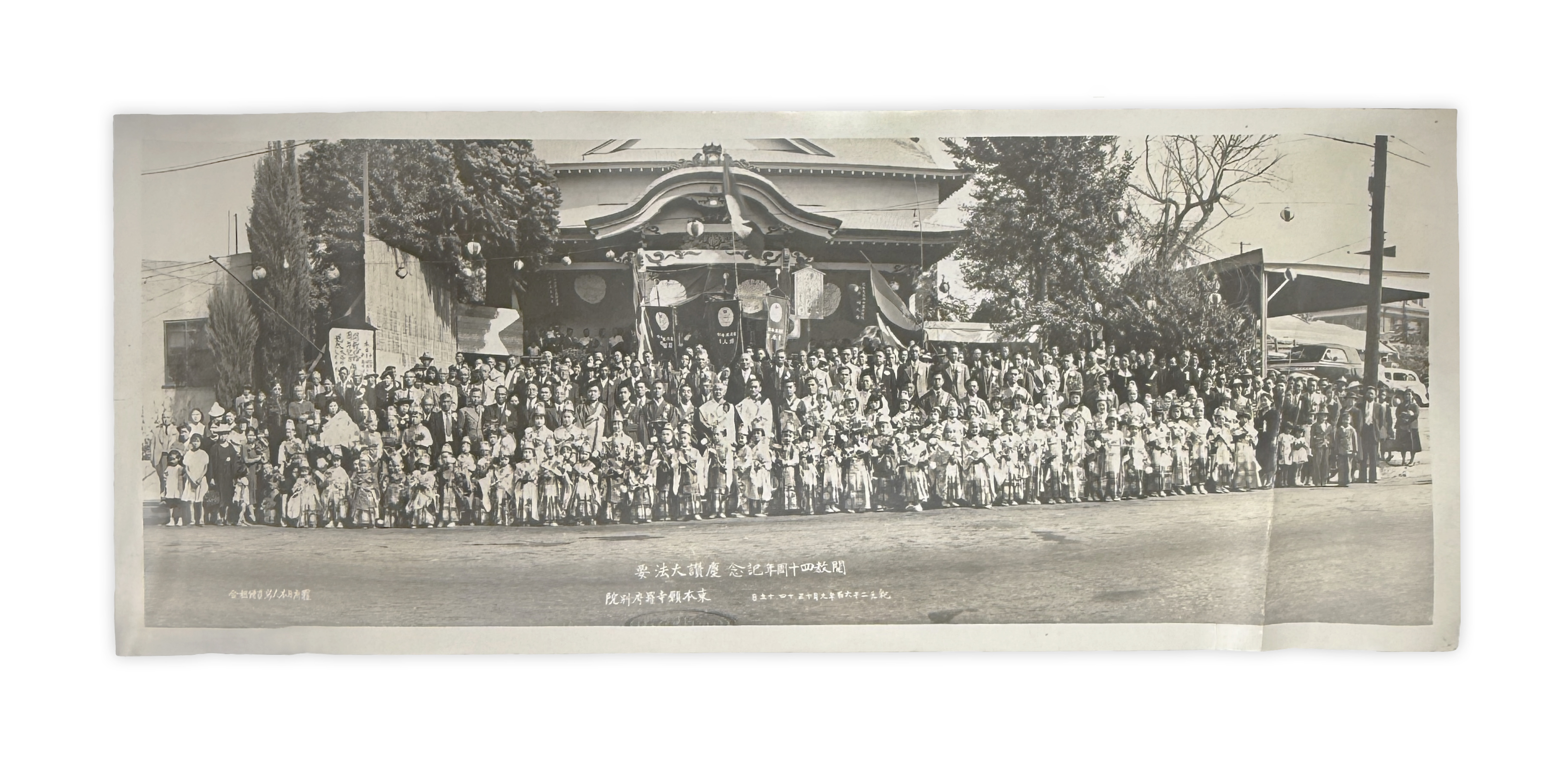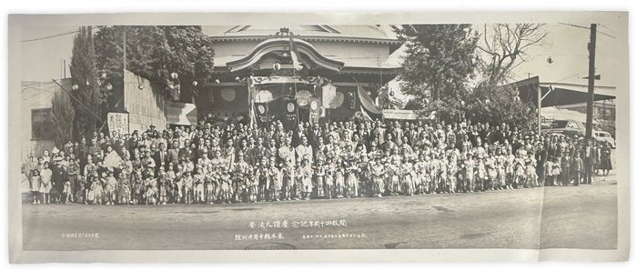 Historically important photograph documenting the celebration of the 40th anniversary of the opening of the Buddhist School at the Los Angeles Branch of the Higashi Honganji Temple. The celebrations took place mid-September of the year 2600 (1940), as stated on the panorama’s negative. The congregation, numbering several hundred people, is pictured in both traditional Japanese and Western attire.