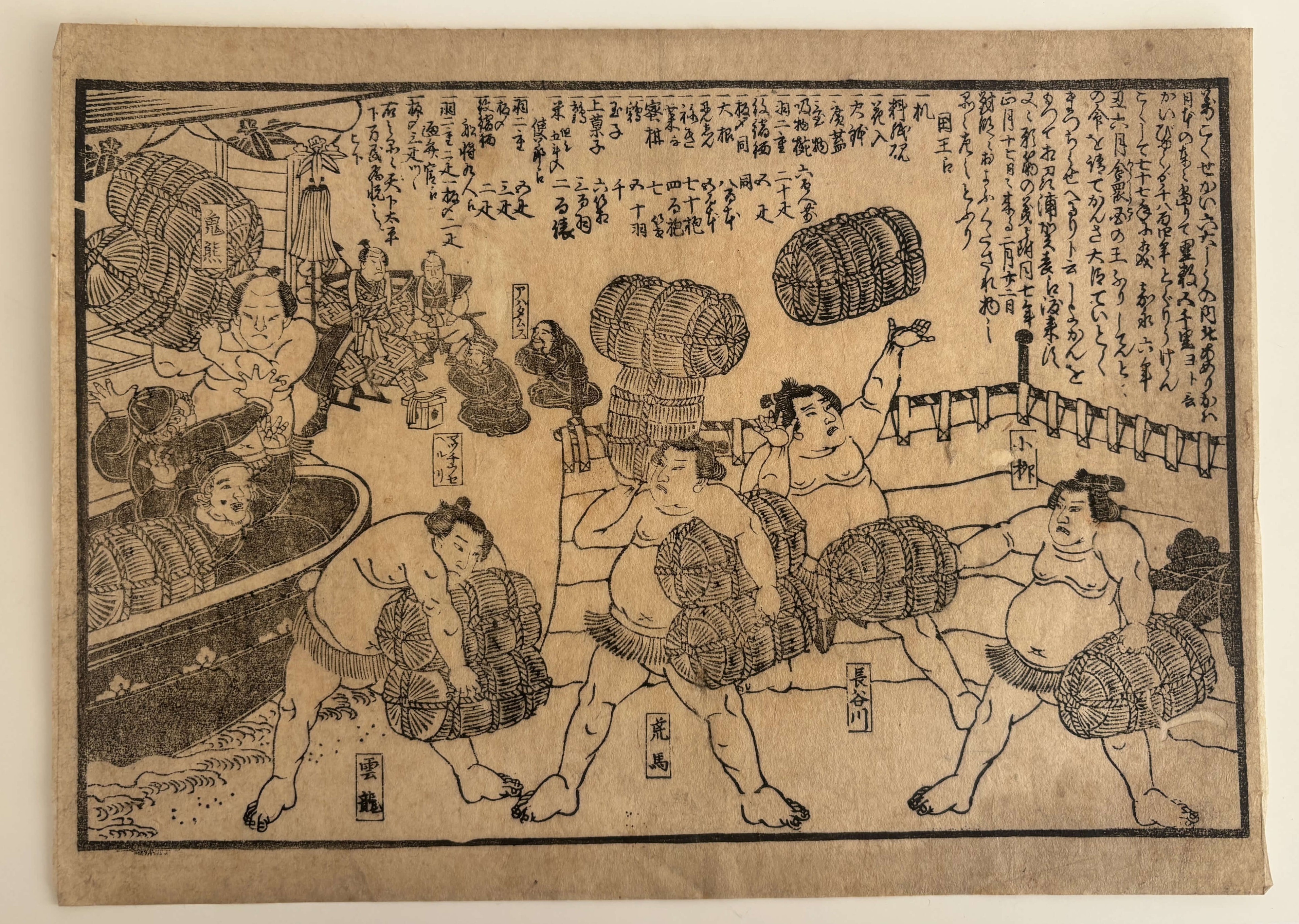 This kawaraban belongs to the genre known as Nihon rikishi namae, a popular Bakumatsu-era format that framed contemporary political and foreign affairs through the visual and rhetorical language of sumo wrestling. In this genre, real historical figures—particularly foreign powers and officials—were assigned sumo-style wrestler names, often humorous or allegorical, and presented in ranked lists familiar to a broad urban audience.