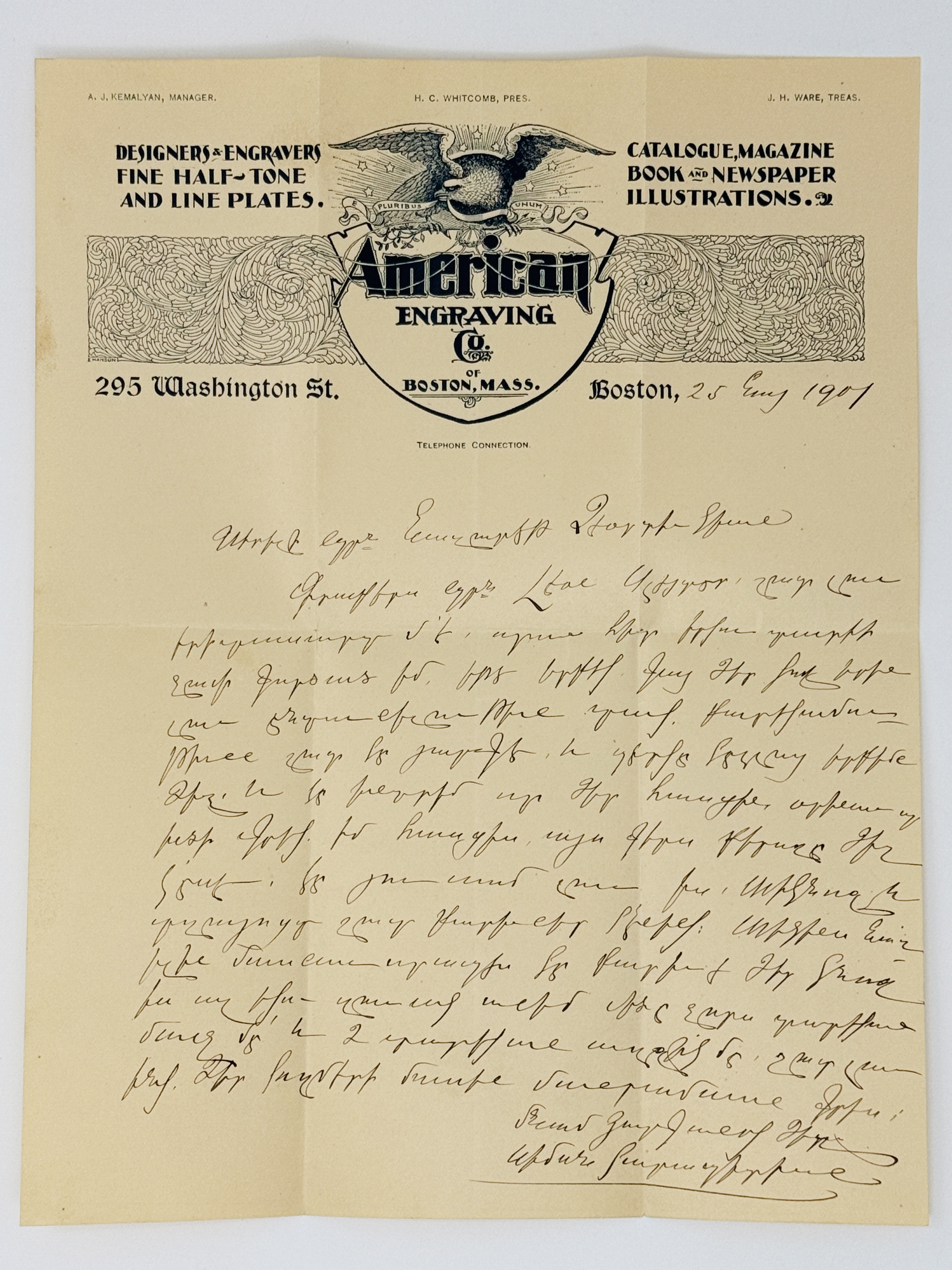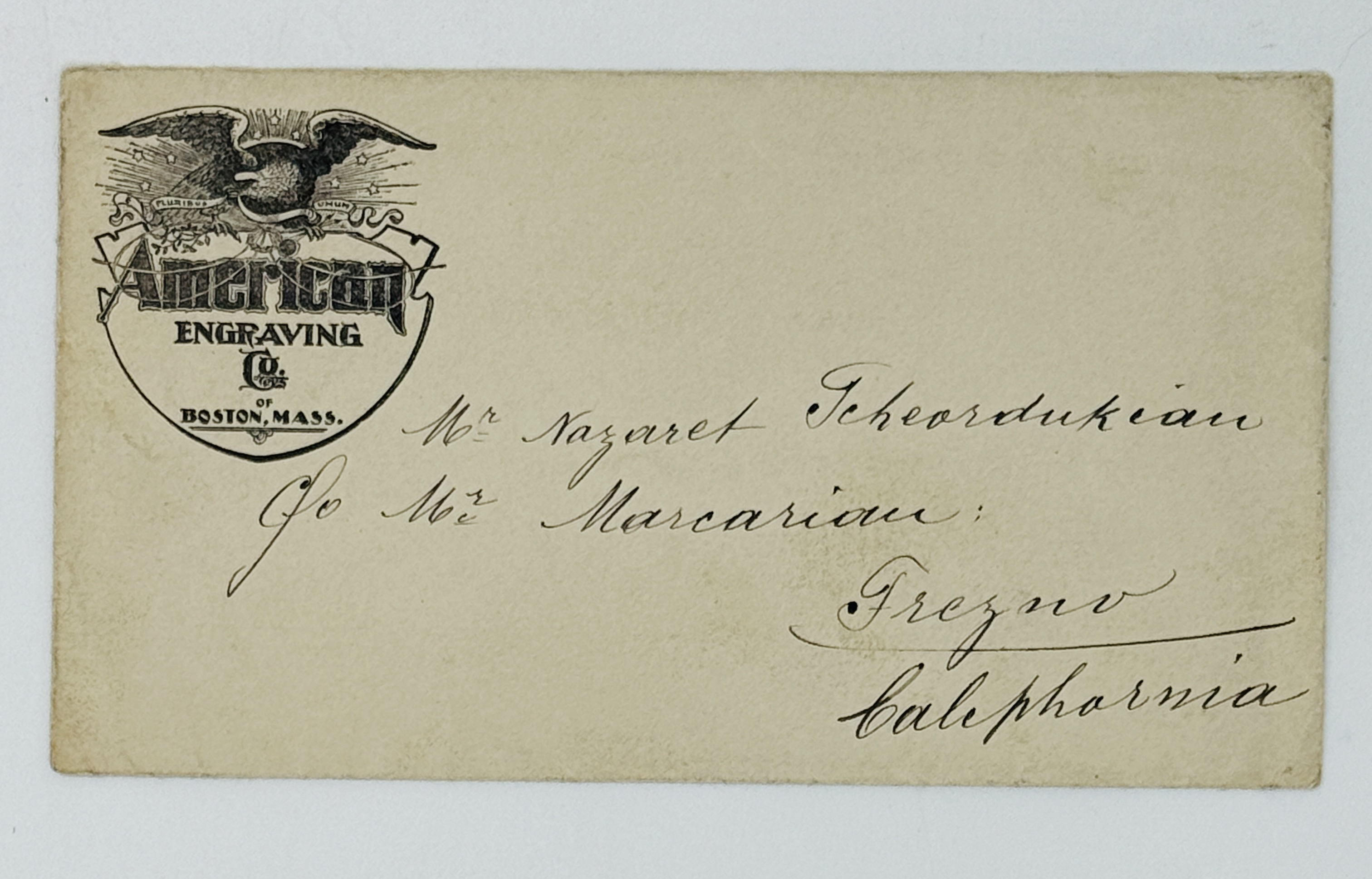 Octavo. Brown ink on creamy paper with ornate printed letterhead “American Engraving Co. of Boston, Mass.” featuring an advertisement: “Designers & Engravers, Fine Half-Tone and Line Plates. Catalogue, Magazine, Book and Newspaper Illustrations.” 2 pp. With the original matching envelope, addressed “Mr. Nazaret Tcheordukian, c/o Mr. Marcarian: Frezno, California”. Text in Western Armenian. Fold marks, light edge wear and toning, otherwise a very good letter.