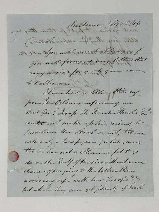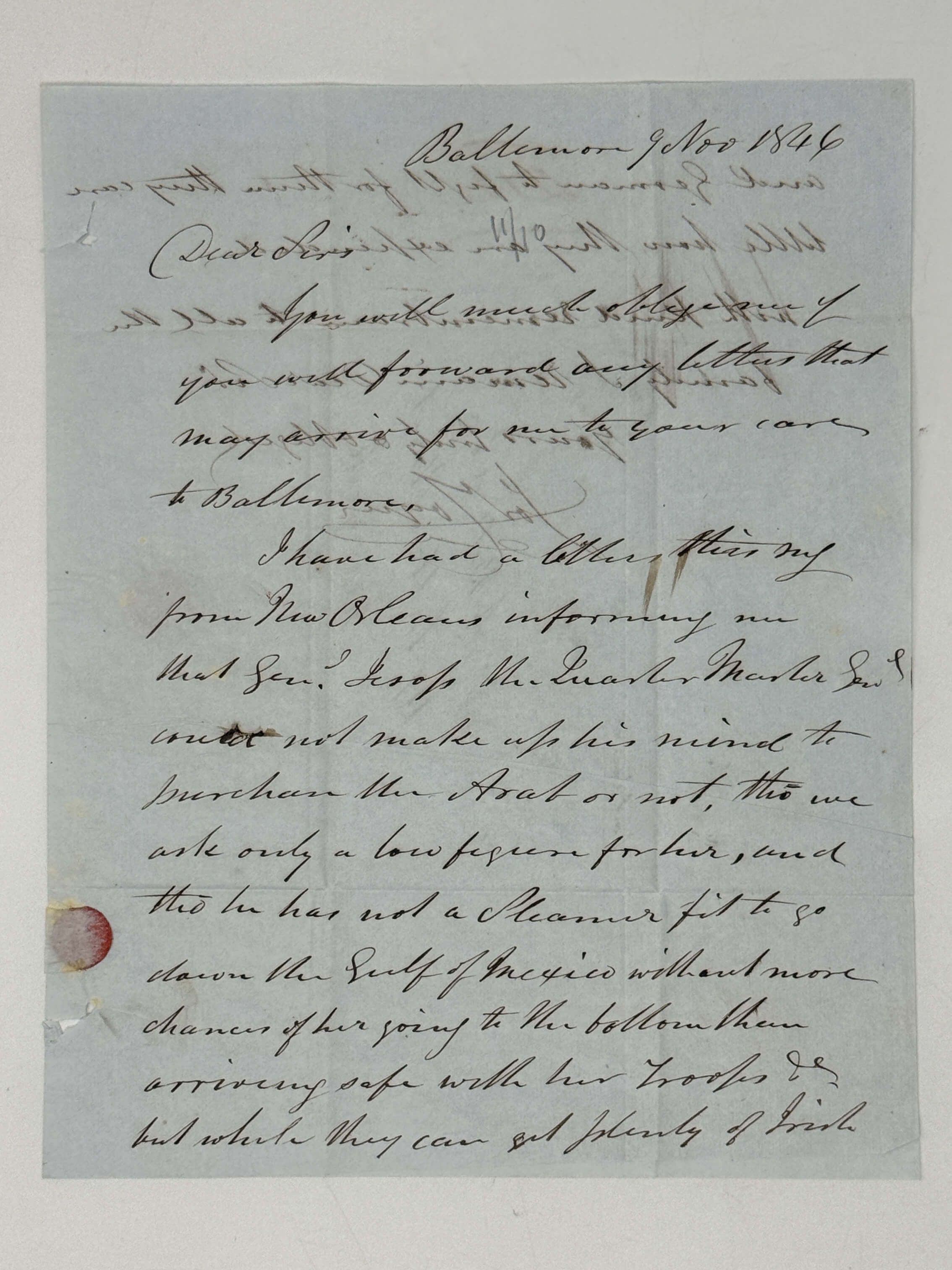 "You will much oblige me if you will forward any letters that may arrive for me to your care to Baltimore. I have had a letter this day from New Orleans informing me that Gen. Jesop the Quarter Master Gen would not make up his mind to purchase the Arab or not. Tho we ask only a low figure for her, and tho he has not a Steamer fit to go down the Gulf of Mexico without more chances of her going to the bottom than arriving safe with her Troops &c. But while they can get plenty of Irish and German to fight for them they care little how many are expended with kind remembrance ..."