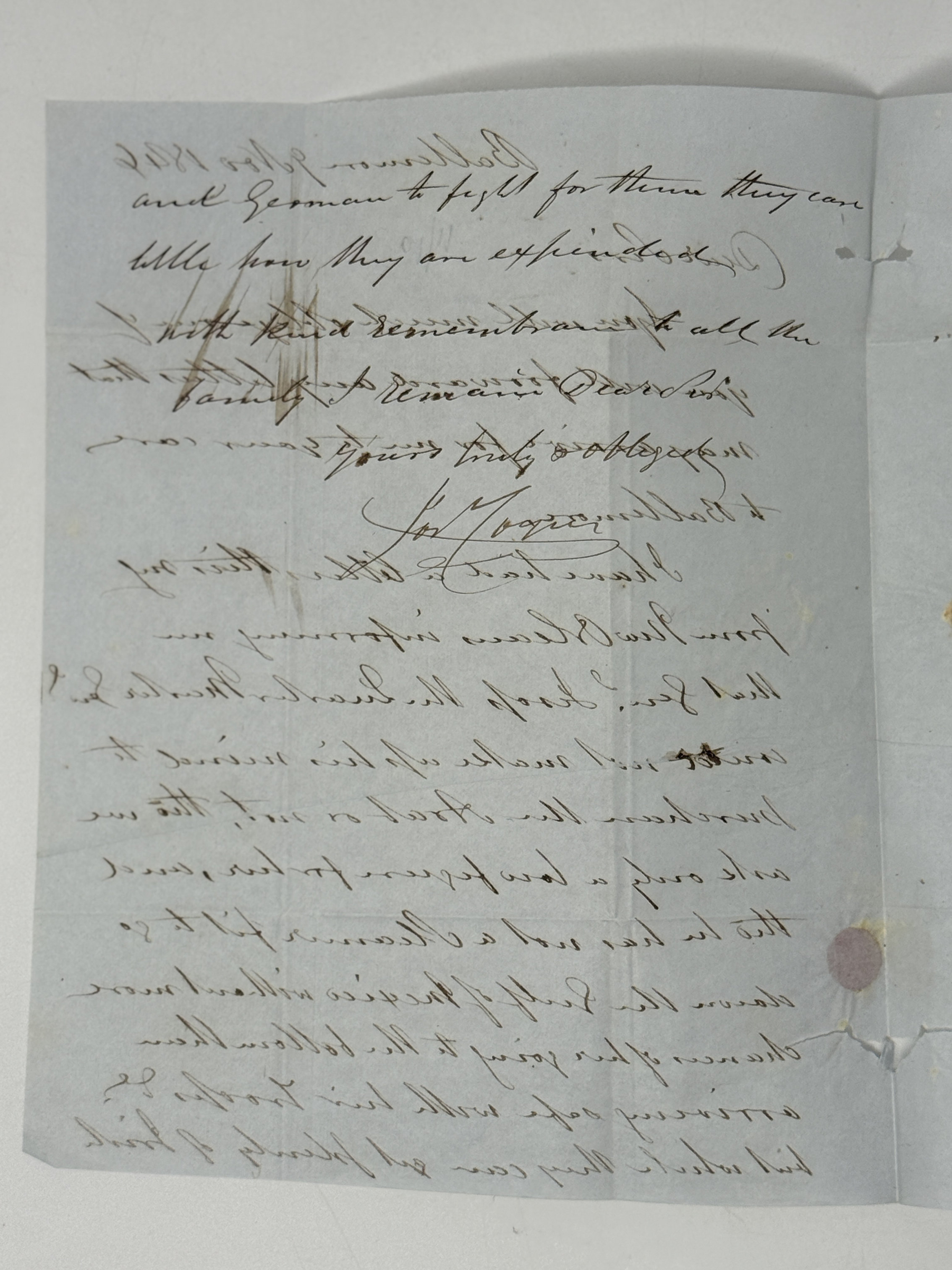 Quarto bifolium ca. 25x19,5 cm (9 ¾ x 7 ¾ in). 2 pp. Brown ink on bluish paper; addressed and stamped on the verso of the second leaf. Foldmarks, with two small holes throughout (no text affected), but overall a very good letter written in a legible hand.
