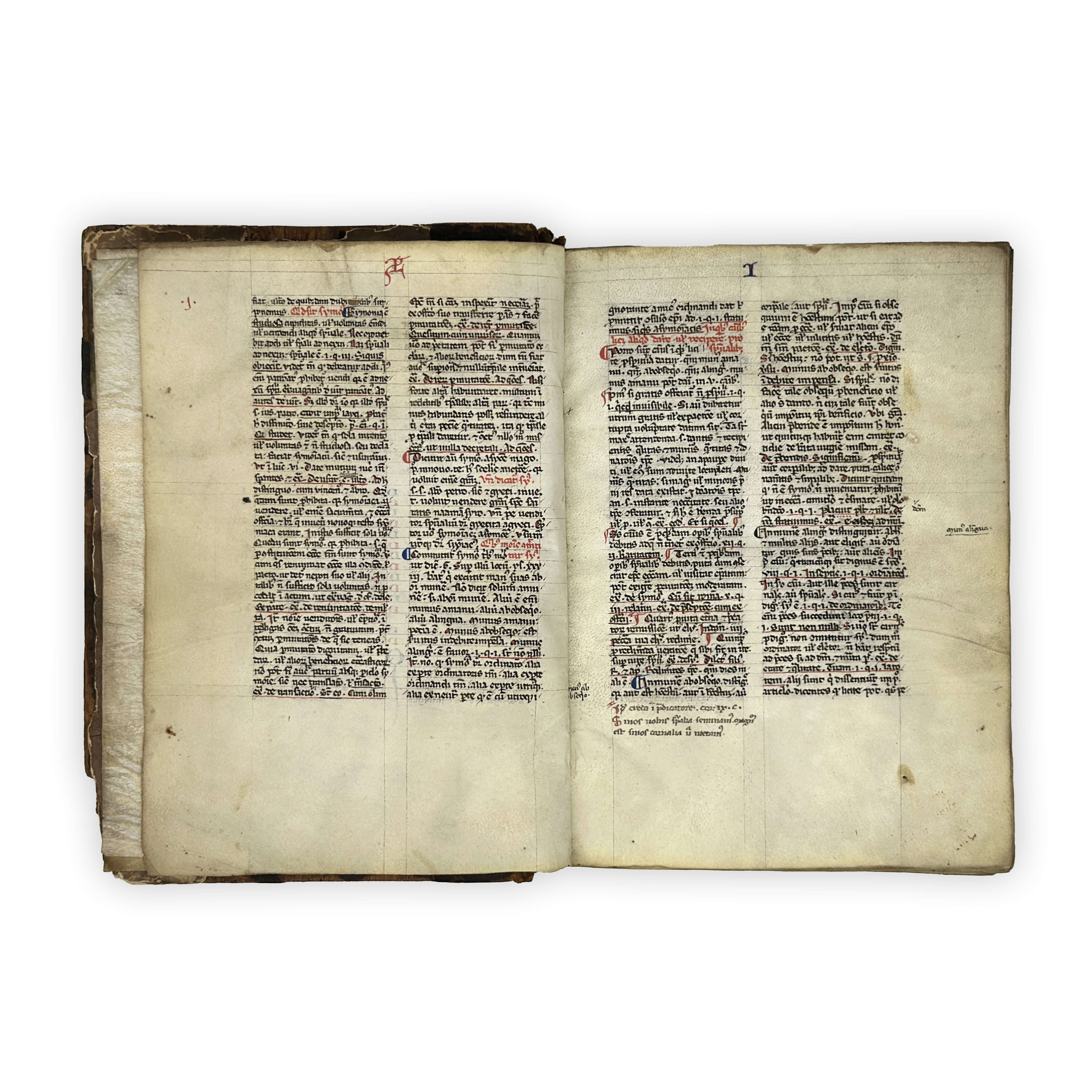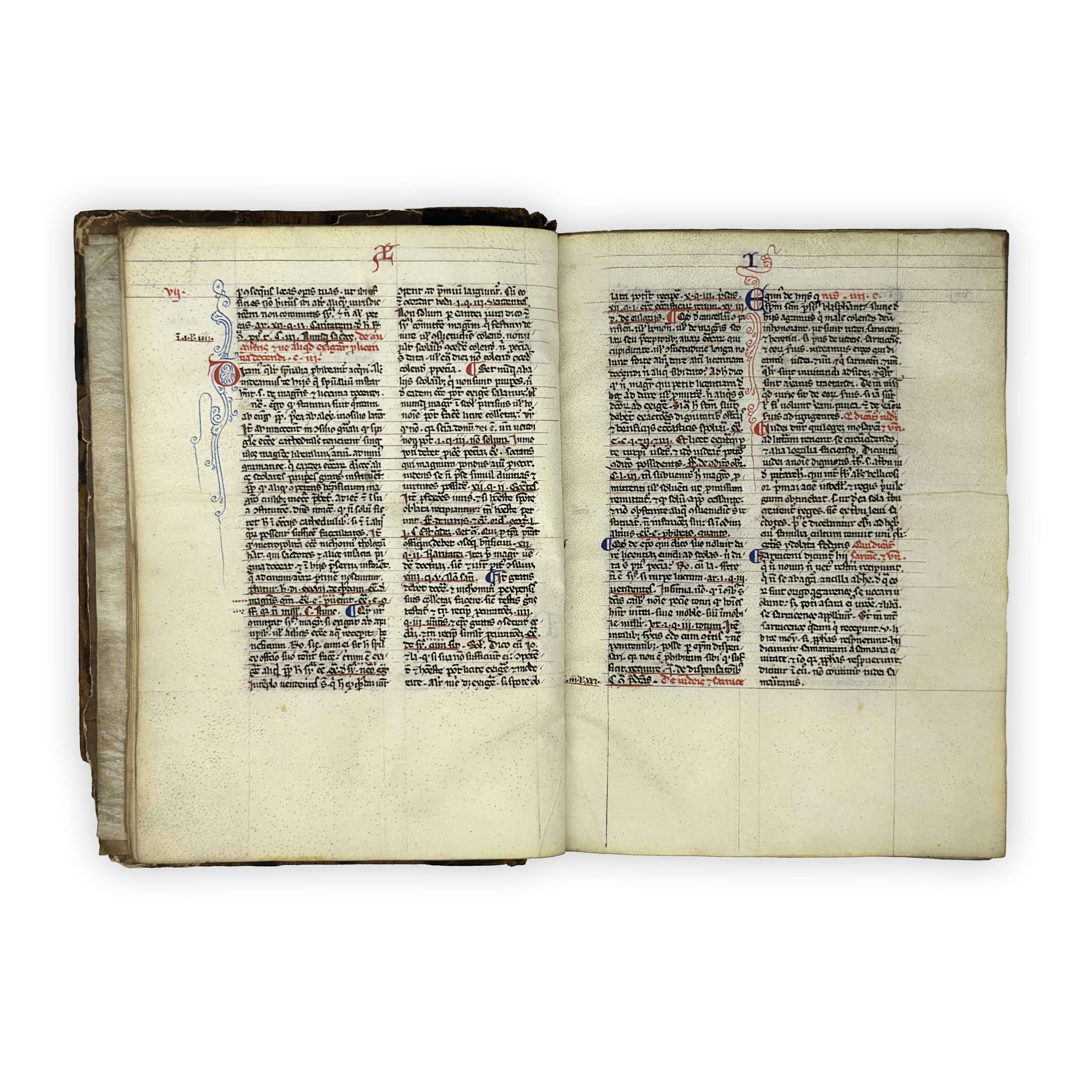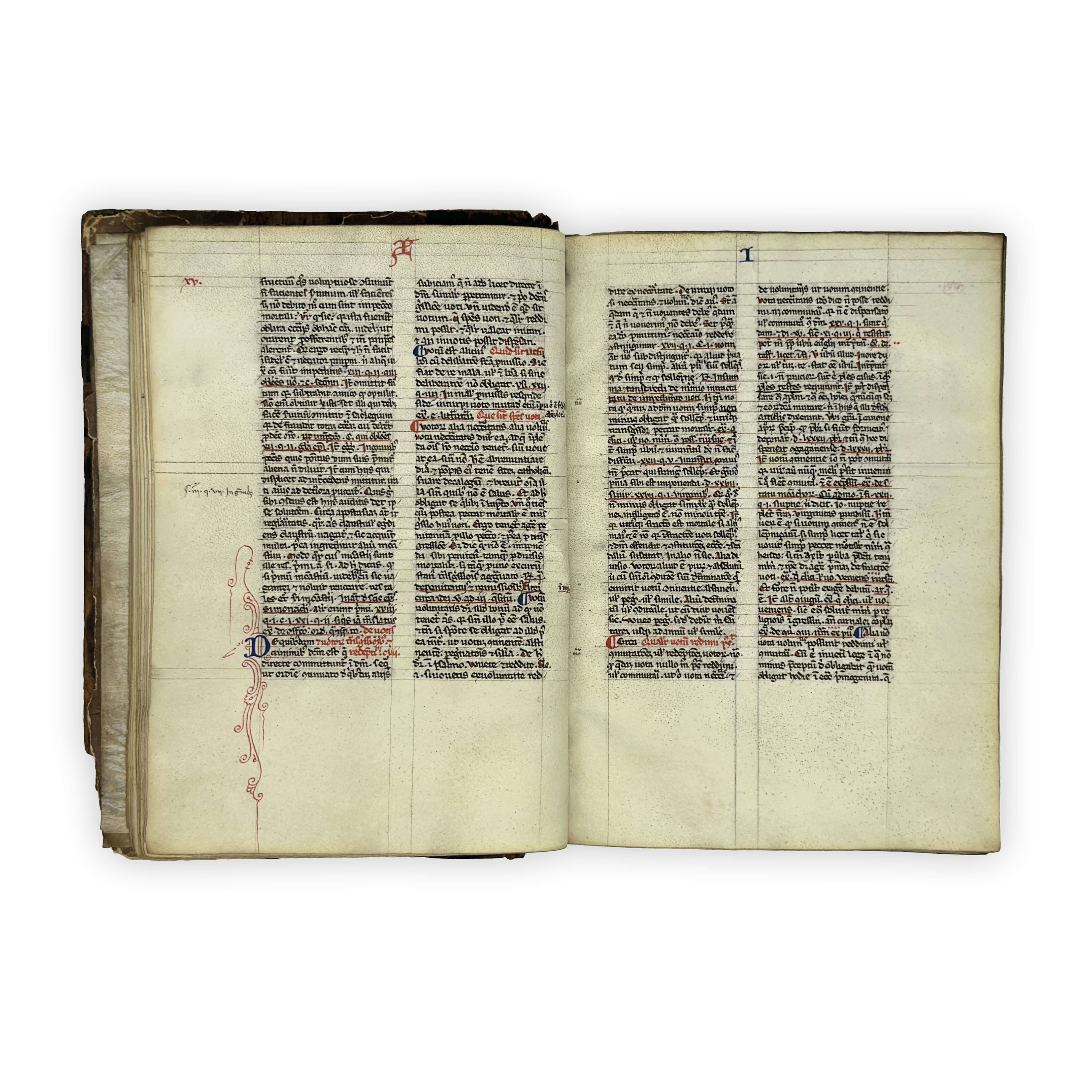 The main text with contemporary foliation for each book in red on the page versos, 37 lines in two columns, ruled space, contemporary marginal annotations, rubrics in red, capitals touched in red, paraphs and small initials alternately red and blue, chapter headings in red and blue, elaborate penwork initials in red and/or blue with alternating flourishes extending into the margins throughout (occasional marginal thumbing and staining, l.268-272 with a horizontal marginal cut not affecting text. Later protective cloth box.