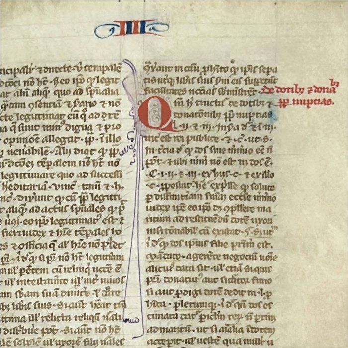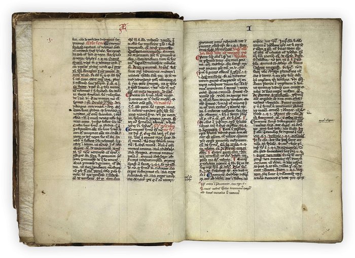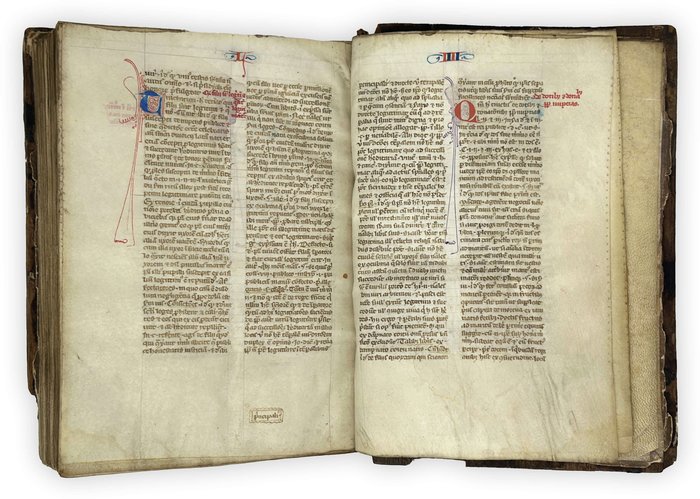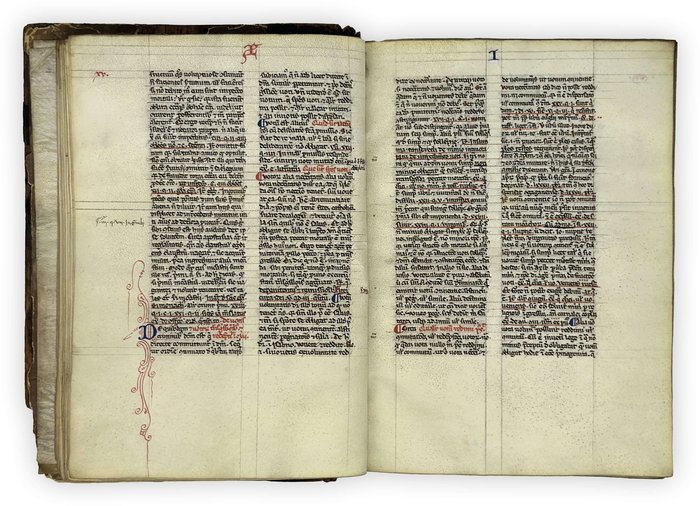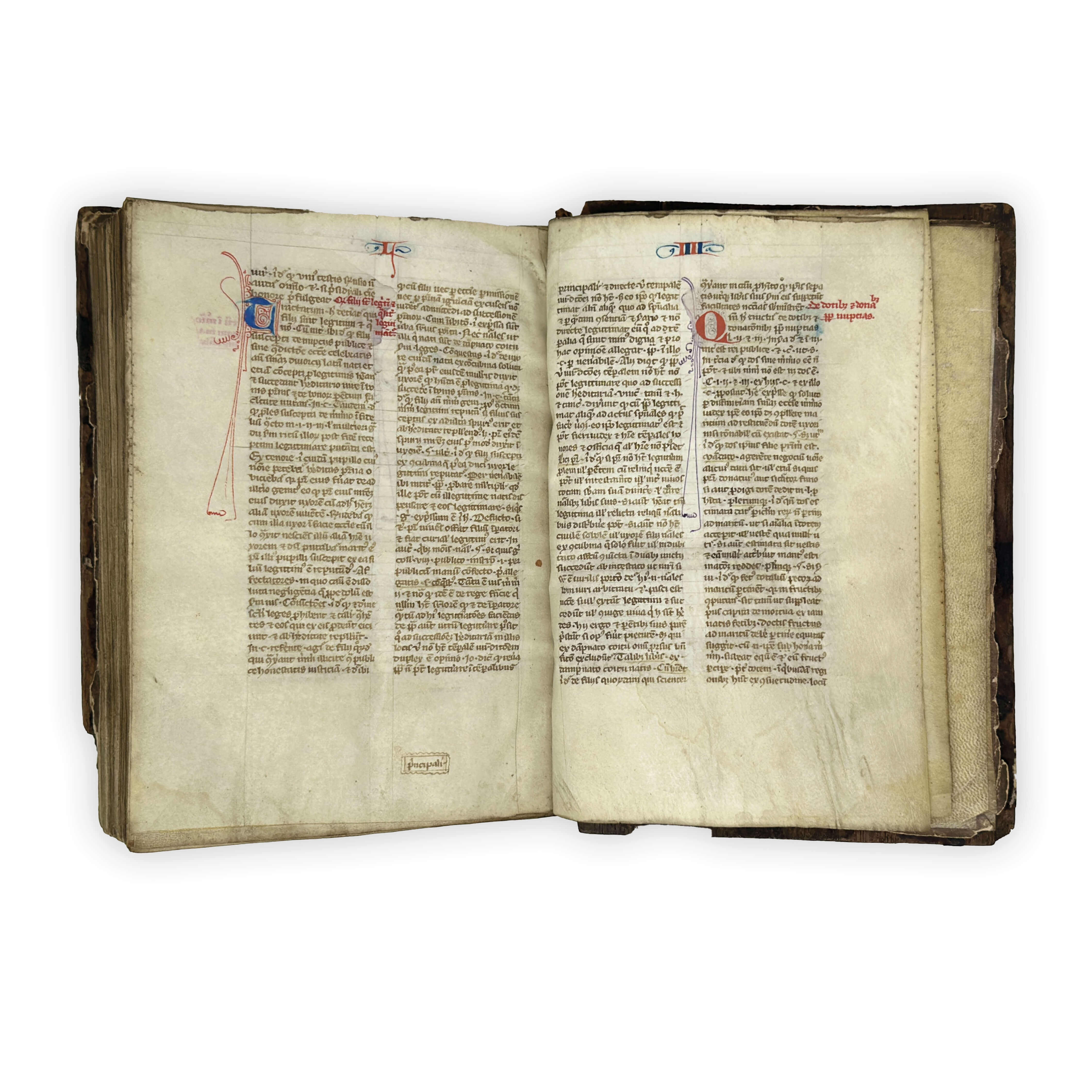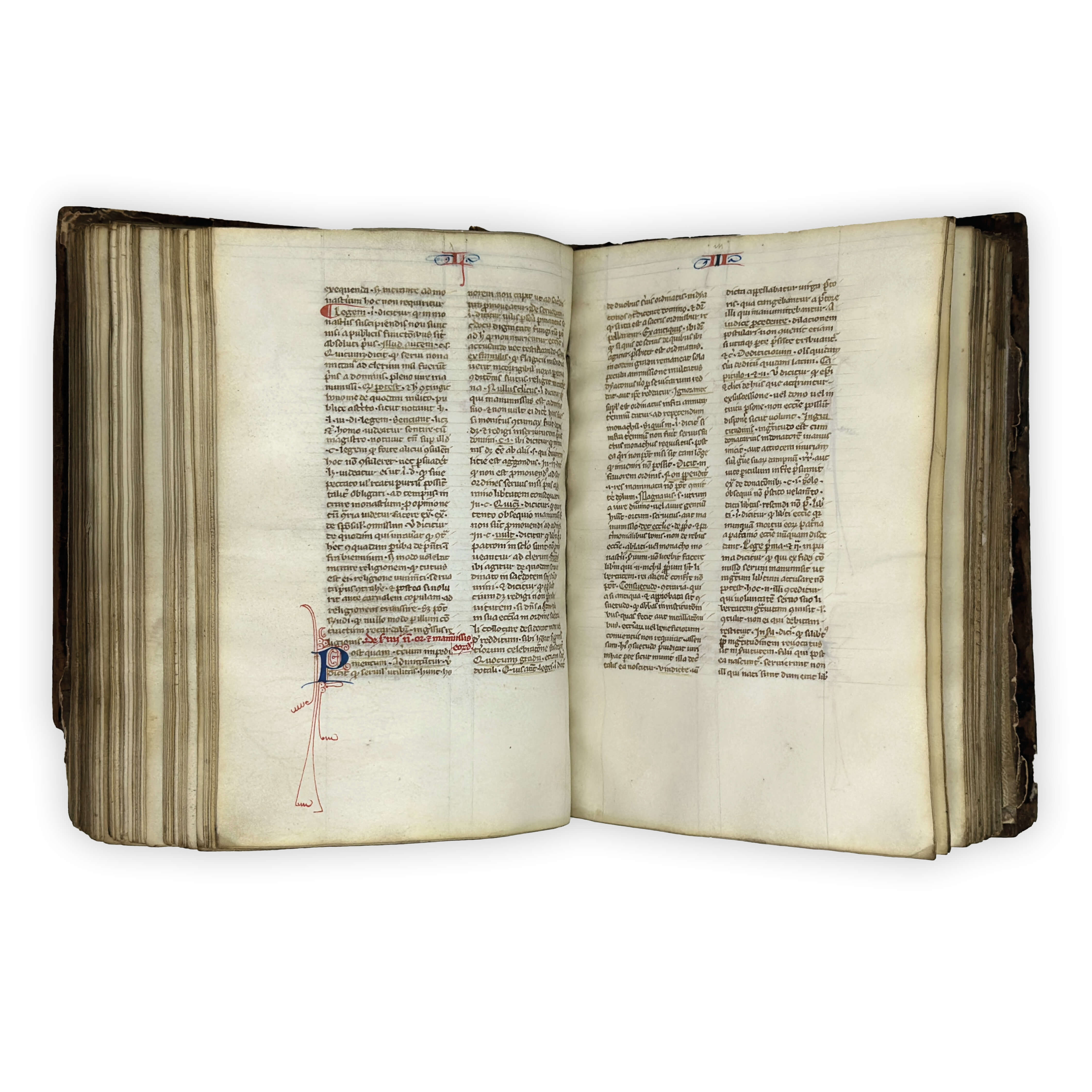 The main text with contemporary foliation for each book in red on the page versos, 37 lines in two columns, ruled space, contemporary marginal annotations, rubrics in red, capitals touched in red, paraphs and small initials alternately red and blue, chapter headings in red and blue, elaborate penwork initials in red and/or blue with alternating flourishes extending into the margins throughout (occasional marginal thumbing and staining, l.268-272 with a horizontal marginal cut not affecting text. Later protective cloth box.