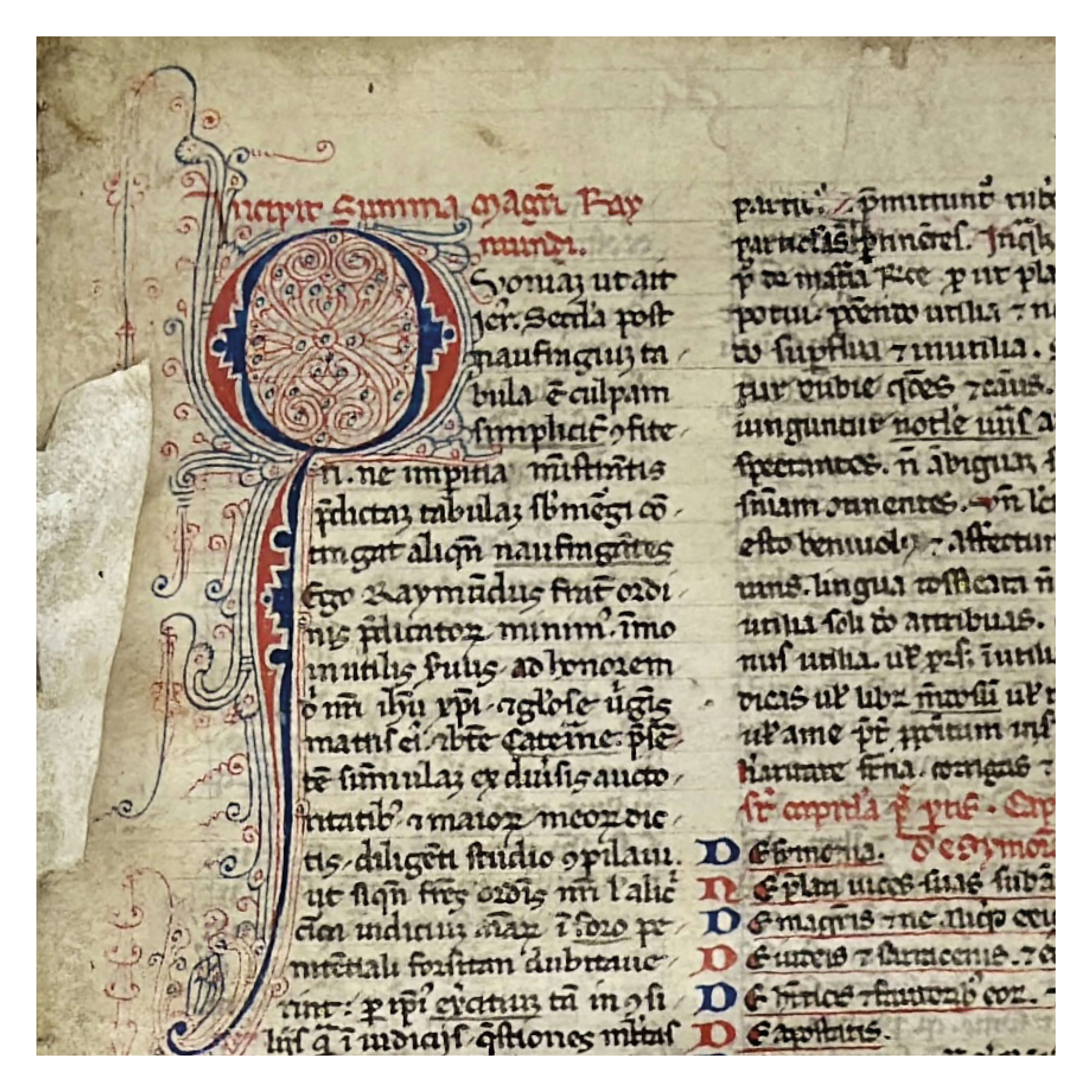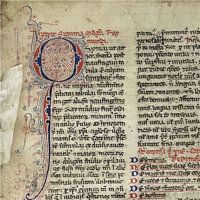 The manuscript contains two of the most popular manuals for confessors in the Middle Ages, authored by Raimundo de Peñafort (1175–1275), a famous Catalan theologian and canonist, associate of King Jaime I and chaplain of Pope Gregory IX, the third general of the Dominican order, canonized in 1601 (patron of canonists and lawyers). He came from a Catalan noble family, studied in Barcelona and Bologna, where he received doctorates in civil and canon law. Returning to Catalonia in 1222, he entered the Dominican Order and soon gained great influence at the court of King James I with his learning, becoming his confessor. In 1230, he was summoned to Rome by Pope Gregory IX to participate in the development of a unified code of canon law. As a result of his work, the first official Code of Canon Law of the Catholic Church was published in 1234, known as the Decretals of Gregory IX or Liber Extra, which became the most famous legal text of the European Middle Ages. In 1236, he returned to the Iberian Peninsula, and from 1238 to 1240 he held the position of General of the Dominican Order, serving at the court of James I. He devoted much attention to missionary work, initiated public disputes between Christians and Jews, and inspired Thomas Aquinas to write the Summa Contra Pagans. The Summa on Cases of Penitence was written by Raymond de Penyafort around 1223–25, after his entry into the Dominican Order. It dealt with various matters of secular and religious life and was intended to assist his fellow Dominicans in hearing confessions, an important function of the Order since its founding. After working on the Decretals of Gregory IX in 1234–35, he compiled a second version of the Summa, bringing it into line with that body of canon law. At the same time, he compiled a Summa on Marriage, which was often circulated as the final book of the first Summa. The manual was a great success, and the second version is known in more than 311 manuscripts, not counting this one. The large number of manuscripts can be explained in part by the fact that Humbert of Rome, the Dominican Master General from 1254 to 1263, included Raymond's manual among the seventeen essential works that were to be contained in all Dominican libraries. It was also among the works considered essential for students at the University of Paris and distributed through its book workshops. However, the complete text of the manual was not printed for the first time until 1603.