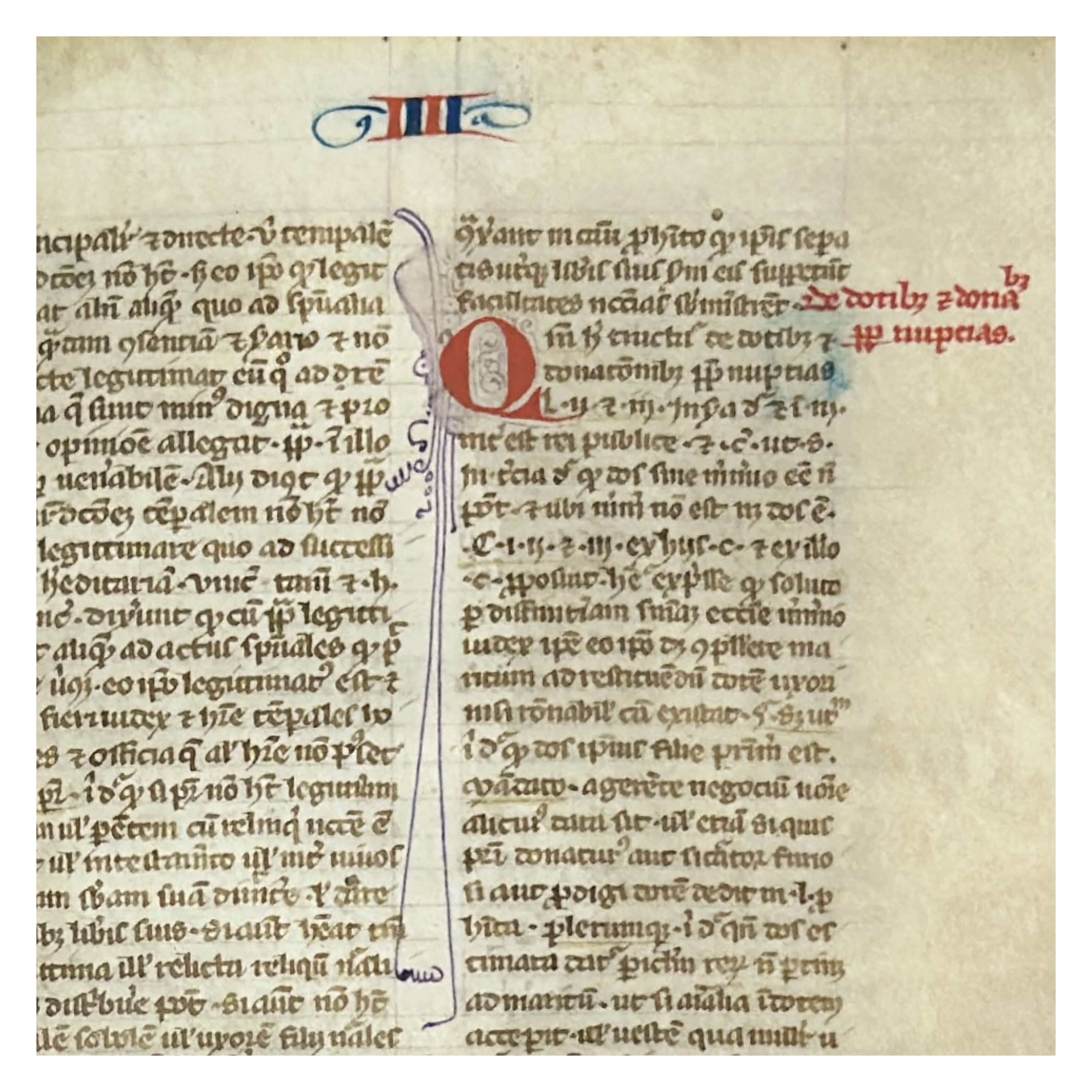 The present manuscript contains the three Books of the Summa de poenitentiae, or Summa Casuum, which were composed between 1222 and 1225, followed by De Matrimonio. The latter was written after Raymond had revised the Summa around 1234. It is an updated version of the treatise of the Bolognese canon lawyer Tancred and was often circulated separately.