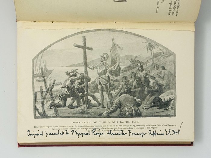 - Printed reproduction of the Arturo Michelena artwork ‘Discovery of the main land’ from World’s Columbian Exposition, inscribed by Partridge at the bottom ‘Original presented to Pedro Ezequiel Rojas, minister of Foreign Affairs EU de V.’ [1] p.
