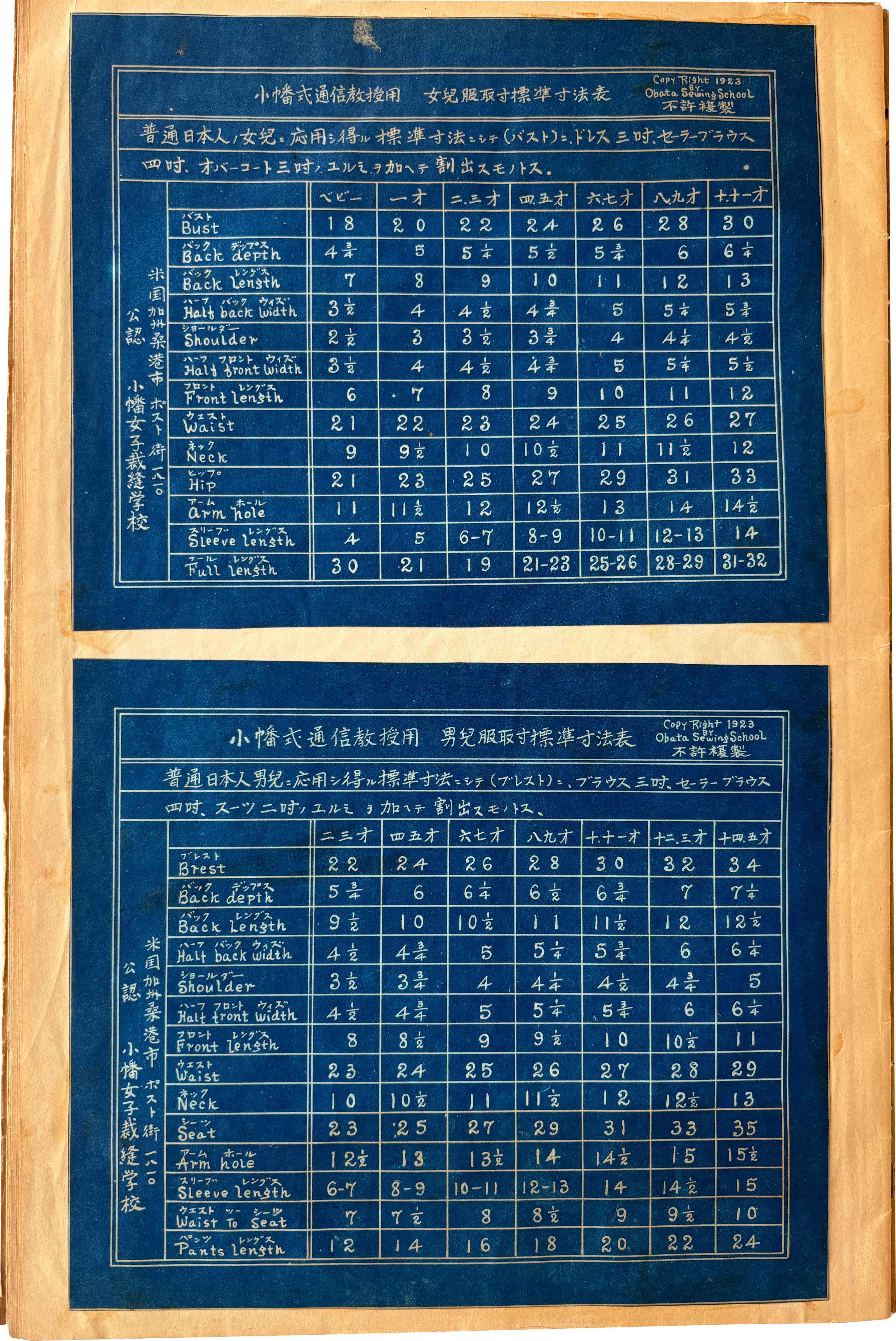 Two volumes compiled by a student at the Obata Sewing School in San Francisco, providing approximately 50 designs, 27 of which are accompanied by pasted-in pencil sketches of the finished product. Date of publication based on the three Obata Sewing School blueprint designs copyright 1923 pasted into one of the volumes.